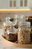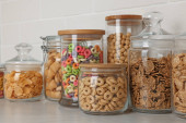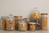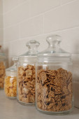Zdjęcie "Pojemniki szklane z różnymi płatkami śniadaniowymi na półce" może być wykorzystywane do celów osobistych i komercyjnych zgodnie z warunkami zakupionej licencji Royalty-free. Obraz jest dostępny do pobrania w jakości wysokiej rozdzielczości do 5760x3840.
