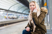 Zdjęcie "Młoda kobieta czeka na pociąg." może być wykorzystywane do celów osobistych i komercyjnych zgodnie z warunkami zakupionej licencji Royalty-free. Obraz jest dostępny do pobrania w jakości wysokiej rozdzielczości do 5760x3840.