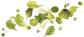 Spadające liście sałatki wyizolowane na białym tle, mieszanka świeżej sałaty, rukoli, jarmużu, szpinaku i różnych liści mikrozielonych
