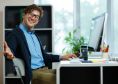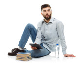 Młody brodaty uśmiechnięty mężczyzna trzyma tabletkę z książek i bott.