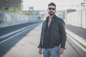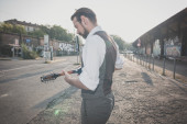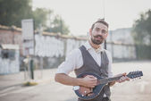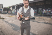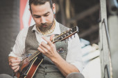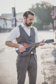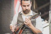 przystojny duże wąsy hipster człowiek grając na mandolinie