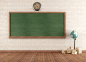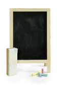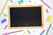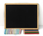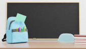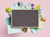 3D ilustracja kilku różowych ołówków umieszczonych w pobliżu pustej tablicy na szarym tle w szkole