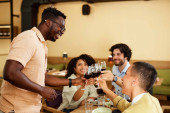 Międzyrasowi przyjaciele wznoszą toast za sukces w restauracji z czerwonym winem.