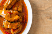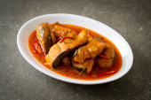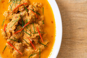 Zdjęcie "Redtail Ryby sum w suchym sosie curry czerwony, który nazywa Choo Chee lub król curry gotowane z ryb serwowane z pikantnym sosem" może być wykorzystywane do celów osobistych i komercyjnych zgodnie z warunkami zakupionej licencji Royalty-free. Obraz jest dostępny do pobrania w jakości wysokiej rozdzielczości do 5760x3840.