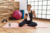 Zdjęcie "Kobieta w średnim wieku siedzi na macie treningowej na siłowni za pomocą smartfona zaskoczony wskazując palcem w bok, otwarte usta zdumiony wyraz. " może być wykorzystywane do celów osobistych i komercyjnych zgodnie z warunkami zakupionej licencji Royalty-free. Obraz jest dostępny do pobrania w jakości wysokiej rozdzielczości do 5760x3840.