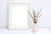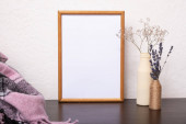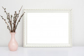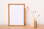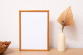 Makieta pusta drewniana rama makieta, suszona trawa w wazonie na białym tle, wnętrze, minimalistyczny wystrój domu. Koncepcja sztuki. przestrzeń kopiowania