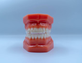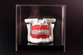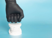 Ręka w czarnej rękawiczce z białą protezą dentystyczną na szarym tle
