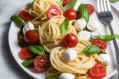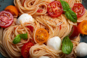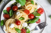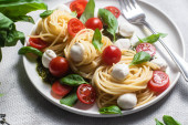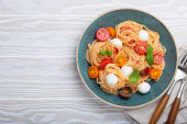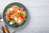 Zdjęcie "Makroskopijna przestrzeń pysznego spaghetti z mozzarellą, kolorowe pomidory wiśniowe, świeża bazylia na płycie ceramicznej widok z góry. Włoski zdrowe smaczne jedzenie makaron na obiad lub obiad" może być wykorzystywane do celów osobistych i komercyjnych zgodnie z warunkami zakupionej licencji Royalty-free. Obraz jest dostępny do pobrania w jakości wysokiej rozdzielczości do 5760x3840.