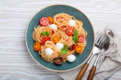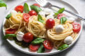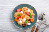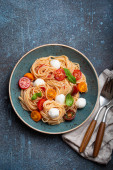 Makroskopijna przestrzeń pysznego spaghetti z mozzarellą, kolorowe pomidory wiśniowe, świeża bazylia na płycie ceramicznej widok z góry. Włoski zdrowe smaczne jedzenie makaron na obiad lub obiad