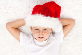 Mała dziewczynka santa kopii przestrzeni przy użyciu komputera typu tablet-