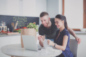 Zdjęcie "Młody mężczyzna kroi warzywa i kobieta stojąc z laptopem w kuchni." może być wykorzystywane do celów osobistych i komercyjnych zgodnie z warunkami zakupionej licencji Royalty-free. Obraz jest dostępny do pobrania w jakości wysokiej rozdzielczości do 5760x3840.