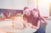 Młody mężczyzna kroi warzywa i kobieta stojąc z laptopem w kuchni.
