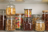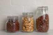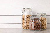 Pojemniki szklane z różnymi płatkami śniadaniowymi na białym blat przy ścianie z cegły