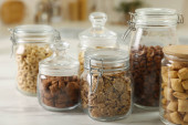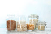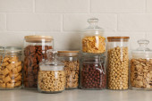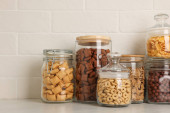 Zdjęcie "Pojemniki szklane z różnymi płatkami śniadaniowymi na białym blat przy ścianie z cegły" może być wykorzystywane do celów osobistych i komercyjnych zgodnie z warunkami zakupionej licencji Royalty-free. Obraz jest dostępny do pobrania w jakości wysokiej rozdzielczości do 5760x3840.