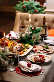 New Year's table with various dishes, alcohol and decorations. On a light, wooden table, there is Olivier salad, tuna salad, stuffed fish, warm veal salad, red caviar on an ice plate, pike caviar on an ice plate. Next to the food is a bottle of champ
