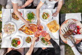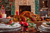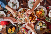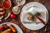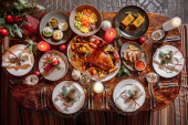 Zdjęcie "New Year's table with various dishes, alcohol and decorations. On a light, wooden table, there is Olivier salad, tuna salad, stuffed fish, warm veal salad, red caviar on an ice plate, pike caviar on an ice plate. Next to the food is a bottle of champ" może być wykorzystywane do celów osobistych i komercyjnych zgodnie z warunkami zakupionej licencji Royalty-free. Obraz jest dostępny do pobrania w jakości wysokiej rozdzielczości do 5760x3840.