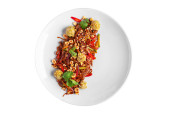 Zdjęcie "Sałatka z pestek dyni, ziemniaki, pietruszka, różne rodzaje sosów, pieprz, cukinia, rukola i mięta w talerzu na białym tle" może być wykorzystywane do celów osobistych i komercyjnych zgodnie z warunkami zakupionej licencji Royalty-free. Obraz jest dostępny do pobrania w jakości wysokiej rozdzielczości do 5760x3840.