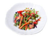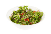 Sałatka z pestek dyni, ziemniaki, pietruszka, różne rodzaje sosów, pieprz, cukinia, rukola i mięta w talerzu na białym tle