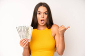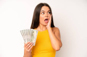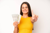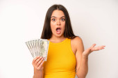 hispanic pretty woma shrugging, feeling confused and uncertain. dollar banknotes concept