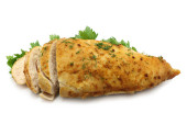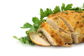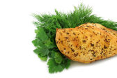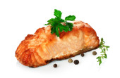 Smażony stek rybny Łosoś biaława zielona szumowina, na białym tle zbliżenie