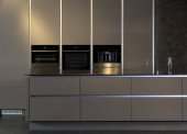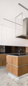 Zdjęcie "Panorama pionowa nowoczesnej kuchni z czarnym sufitem i szafek i drewnianych szafek, backsplash i blat i szary płytek podłogowych" może być wykorzystywane do celów osobistych i komercyjnych zgodnie z warunkami zakupionej licencji Royalty-free. Obraz jest dostępny do pobrania w jakości wysokiej rozdzielczości do 5760x3840.