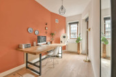 Wygodne krzesło umieszczone w pobliżu biurka z monitorami komputerowymi i tablicą w lekkim miejscu pracy w nowoczesnym apartamencie