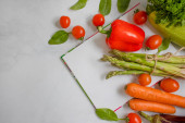 Plate of different vegetables and fruits on a light background