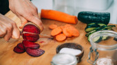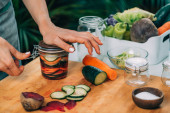 Fermenting vegetables at home. Woman preparing vegetables for fermentation.