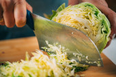 Fermenting vegetables. Woman shredding carrots, preparing them for fermentation.