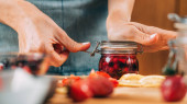 Vegetable fermentation. Woman holding jar with fermented vegetables.