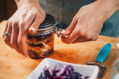 Vegetable fermentation. Woman holding jar with fermented vegetables.