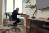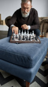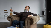 Grey hair caucasian man resting and taking selfie on smartphone in armchair in spacious flat. Fashionable bearded pensioner. Modern senior male lifestyle. Domestic entertainment and leisure