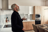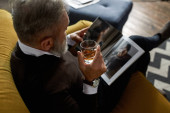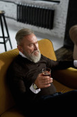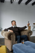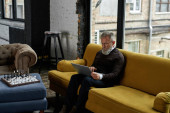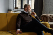 Zdjęcie "Grey hair caucasian man resting and taking selfie on smartphone in armchair in spacious flat. Fashionable bearded pensioner. Modern senior male lifestyle. Domestic entertainment and leisure" może być wykorzystywane do celów osobistych i komercyjnych zgodnie z warunkami zakupionej licencji Royalty-free. Obraz jest dostępny do pobrania w jakości wysokiej rozdzielczości do 5760x3840.