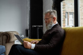 Elderly focused caucasian man reading journal on sofa at home. Trendy bearded pensioner wearing casual clothes. Modern senior male lifestyle. Domestic rest and leisure. Spacious apertment interior