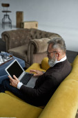 Zdjęcie "Elderly focused caucasian man reading journal on sofa at home. Trendy bearded pensioner wearing casual clothes. Modern senior male lifestyle. Domestic rest and leisure. Spacious apertment interior" może być wykorzystywane do celów osobistych i komercyjnych zgodnie z warunkami zakupionej licencji Royalty-free. Obraz jest dostępny do pobrania w jakości wysokiej rozdzielczości do 5760x3840.