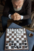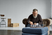 Grey hair thoughtful caucasian man playing chess with himself in armchair in spacious flat. Fashionable bearded pensioner. Modern senior male lifestyle. Domestic entertainment, hobby and leisure