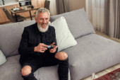 Zdjęcie "Senior thoughtful caucasian man drinking whiskey and looking away on sofa in spacious apartment. Stylish bearded pensioner. Modern elderly male lifestyle. Domestic rest and free time" może być wykorzystywane do celów osobistych i komercyjnych zgodnie z warunkami zakupionej licencji Royalty-free. Obraz jest dostępny do pobrania w jakości wysokiej rozdzielczości do 5760x3840.