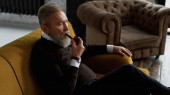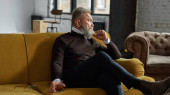 Senior smiling caucasian man taking selfie on smartphone in armchair in spacious apartment. Stylish bearded pensioner. Modern senior male lifestyle. Domestic entertainment and leisure