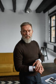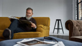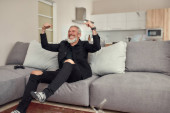 Zdjęcie "Senior smiling caucasian man taking selfie on smartphone in armchair in spacious apartment. Stylish bearded pensioner. Modern senior male lifestyle. Domestic entertainment and leisure" może być wykorzystywane do celów osobistych i komercyjnych zgodnie z warunkami zakupionej licencji Royalty-free. Obraz jest dostępny do pobrania w jakości wysokiej rozdzielczości do 5760x3840.
