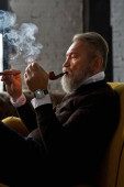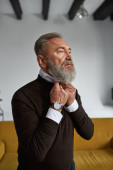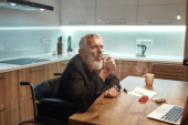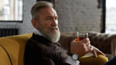 Elderly thoughtful caucasian man drinking whiskey or cognac on sofa in spacious apartment. Trendy bearded pensioner wearing casual clothes. Modern senior male lifestyle. Home rest and free time