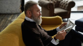 Zdjęcie "Elderly thoughtful caucasian man drinking whiskey or cognac on sofa in spacious apartment. Trendy bearded pensioner wearing casual clothes. Modern senior male lifestyle. Home rest and free time" może być wykorzystywane do celów osobistych i komercyjnych zgodnie z warunkami zakupionej licencji Royalty-free. Obraz jest dostępny do pobrania w jakości wysokiej rozdzielczości do 5760x3840.