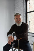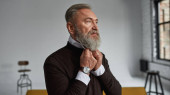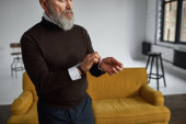 Partial image of ederly serious caucasian man correcting shirt collar in spacious apartment. Trendy bearded pensioner wearing casual clothes. Concept of modern senior male lifestyle. Daytime