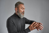Zdjęcie "Partial image of ederly serious caucasian man correcting shirt collar in spacious apartment. Trendy bearded pensioner wearing casual clothes. Concept of modern senior male lifestyle. Daytime" może być wykorzystywane do celów osobistych i komercyjnych zgodnie z warunkami zakupionej licencji Royalty-free. Obraz jest dostępny do pobrania w jakości wysokiej rozdzielczości do 5760x3840.