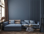 Home mockup, living room interior in dark blue color, 3d render