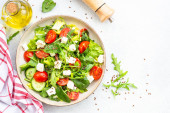 Zdjęcie "Greek salad. Vegetable salad with tomato, cucumber, feta cheese and olive oil. Top view on white stone table." może być wykorzystywane do celów osobistych i komercyjnych zgodnie z warunkami zakupionej licencji Royalty-free. Obraz jest dostępny do pobrania w jakości wysokiej rozdzielczości do 5760x3840.