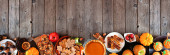 Traditional German Oktoberfest meal. Above view top border on a dark wood banner background. Pretzels beer, sausage, sauerkraut and potato dumplings.