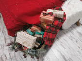 Wigilia. czerwony kolor ozdobione skarpetki wiszące na choince z bokeh lekkie tło, wakacje rodziny, szczęśliwy nowy rok i Wesołych Świąt koncepcja festiwal, vintage kolor dźwięk efekt.