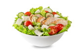 Green Salad with mozzarella cheese, black olives, arugula and tomato isolated on white background