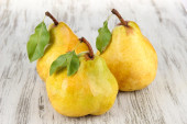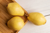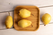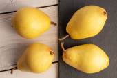 Three sweet bright yellow pears with a white ceramic saucer on a slate stone, close-up, top view.