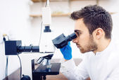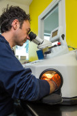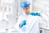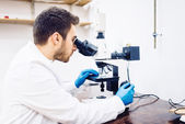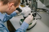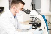 Naukowiec badanie próbek i praca z mikroskopem, analizy w laboratorium kryminalistyczne